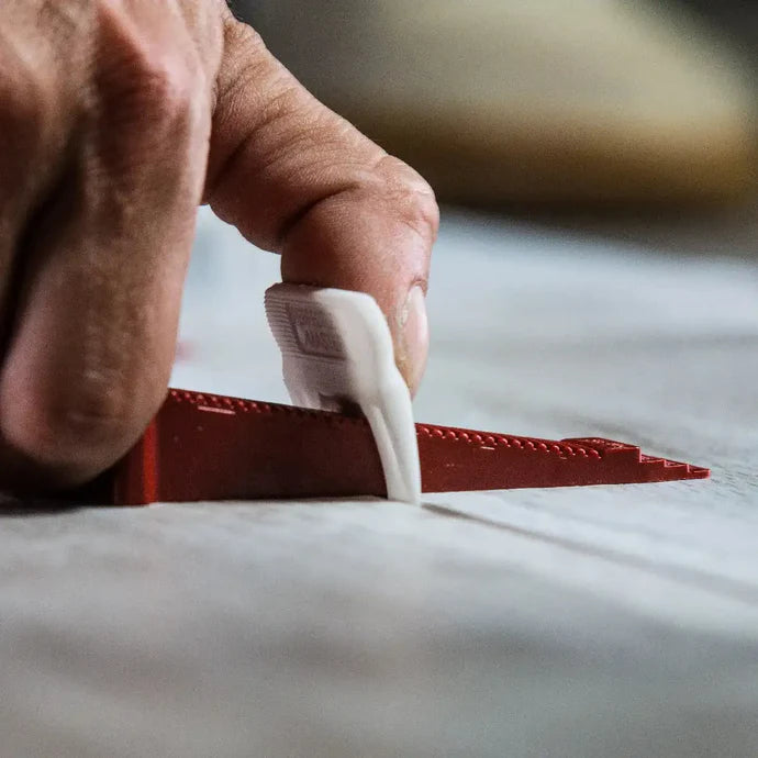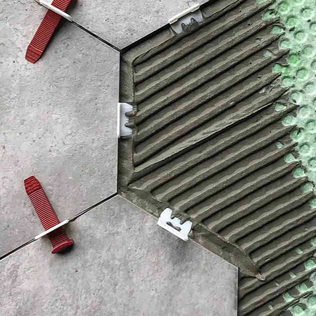 - Single-use clips are designed to snap off cleanly along the grout line after cure.