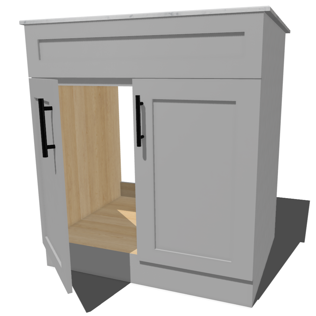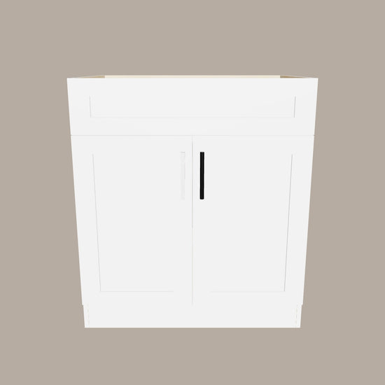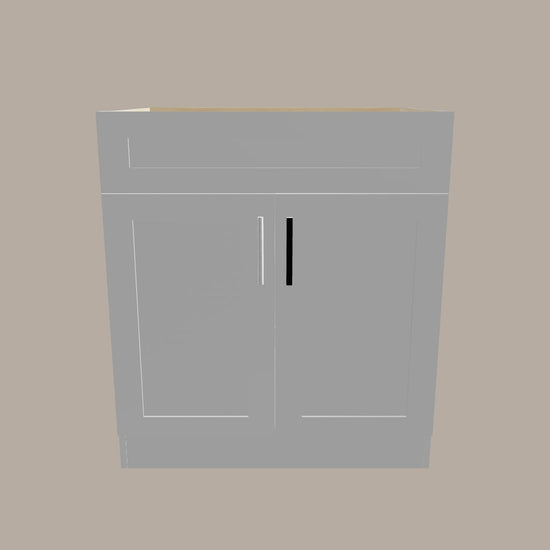 A crisp Shaker profile scaled to 30". The cabinet is plywood with solid-wood doors, finished inside in natural wood for a warm, tailored look. Clip-on European hinges are soft-close and 3-way adjustable (vertical, horizontal, depth) for perfect reveals. Choose White or Gray, then finish the look with square or round pulls in brushed nickel or matte black. It is built with dowels and pre-inserted nuts for rigid, long-lasting joinery.