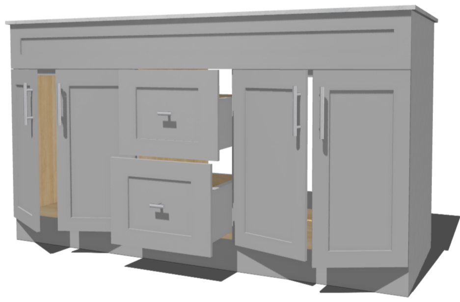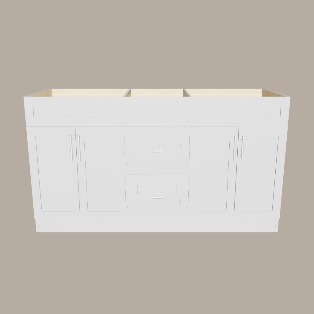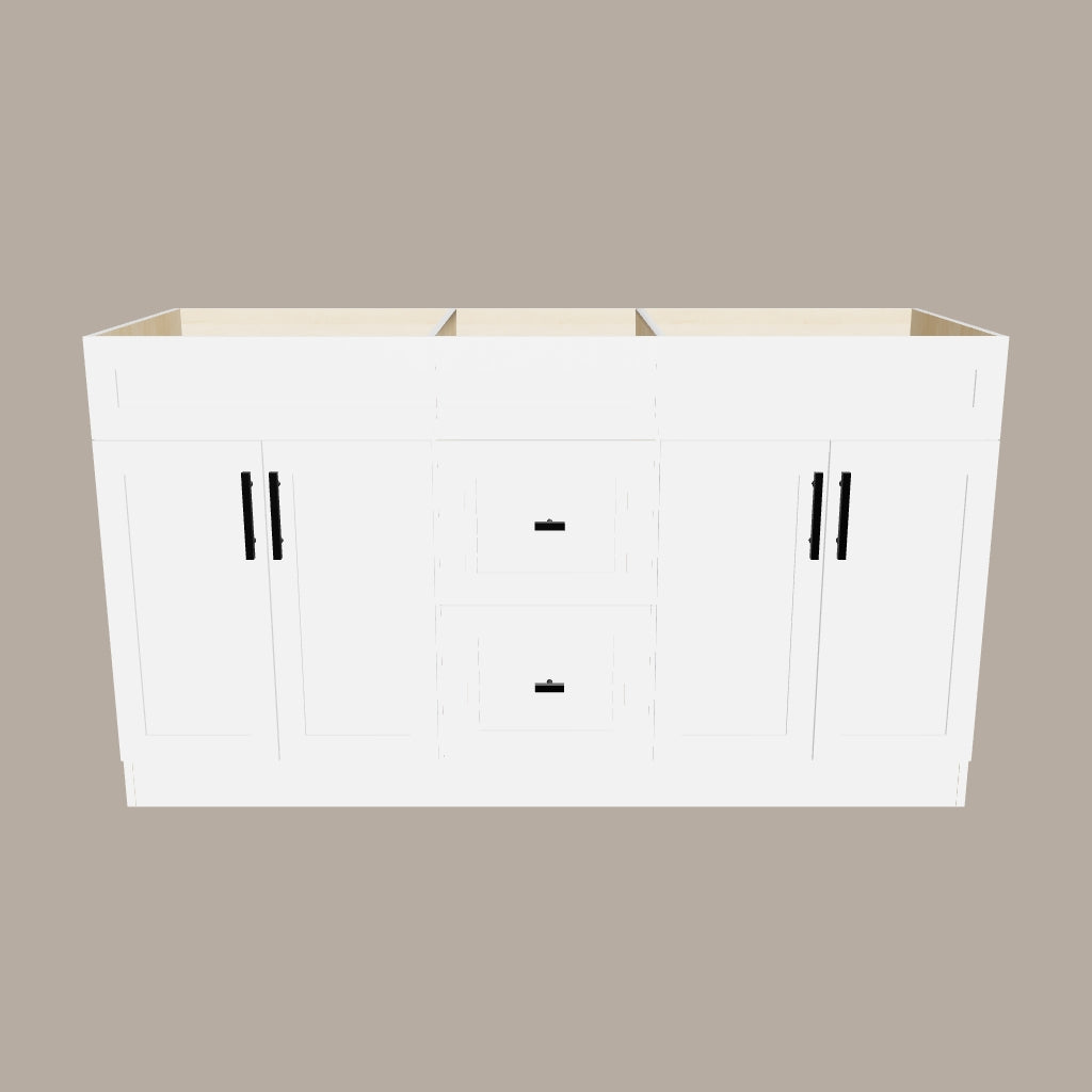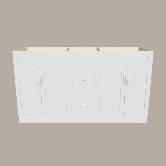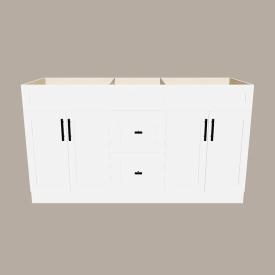 A balanced Shaker silhouette sized for 60" double-sink layouts. Built like fine cabinetry with a plywood case and solid-wood doors, it closes quietly on clip-on European hinges that are soft-close and 3-way adjustable (vertical, horizontal, depth). Inside, the natural-wood interior and dowel + pre-inserted-nut joinery feel rigid and refined. Storage is practical: double doors on both sides with two drawers centered. Choose White or Gray, then finish with square or round pulls in brushed nickel or matte black. (Shoppers often scan for “soft-close” and Shaker at this width.)