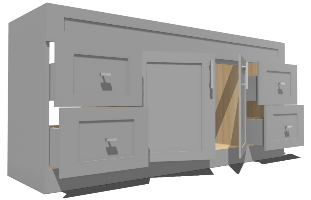 This is a calm, architectural Shaker profile at 72", configured for a single sink. Built like real cabinetry with a plywood case and solid-wood doors, it closes quietly on clip-on European hinges that are soft-close and 3-way adjustable (vertical, horizontal, depth). Inside, a natural-wood interior and dowel + pre-inserted-nut joinery feel rigid and refined. Storage is balanced: two drawers per side with a center double door. Choose White or Gray, and finish with square or round pulls in brushed nickel or matte black.